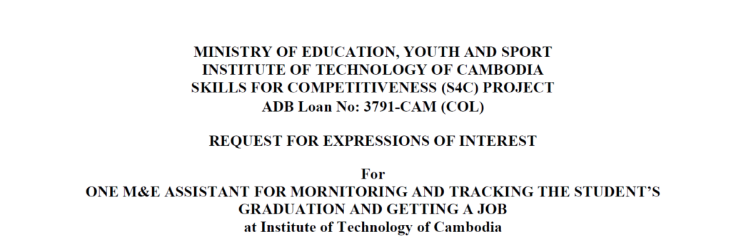 procurementសេចក្តីជូនដំណឹងស្តីពីការជ្រើសរើសជំនួយការគម្រោង បម្រើការងារនៅវិទ្យាស្ថានបច្ចេកវិទ្យាកម្ពុជា lun chanmaranden / February 19, 2026