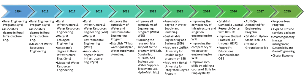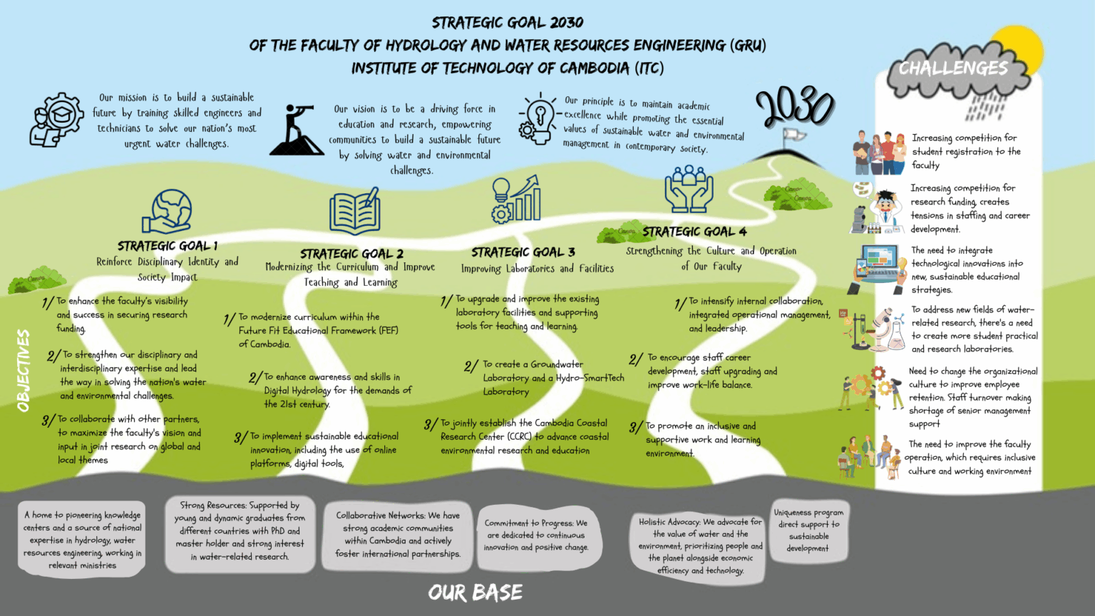 Our vision is to be a driving force in education and research, empowering communities to build a sustainable future by solving water and environmental challenges. We aim to be a leader in research and education in hydrology, water resources, and environmental engineering in Cambodia.