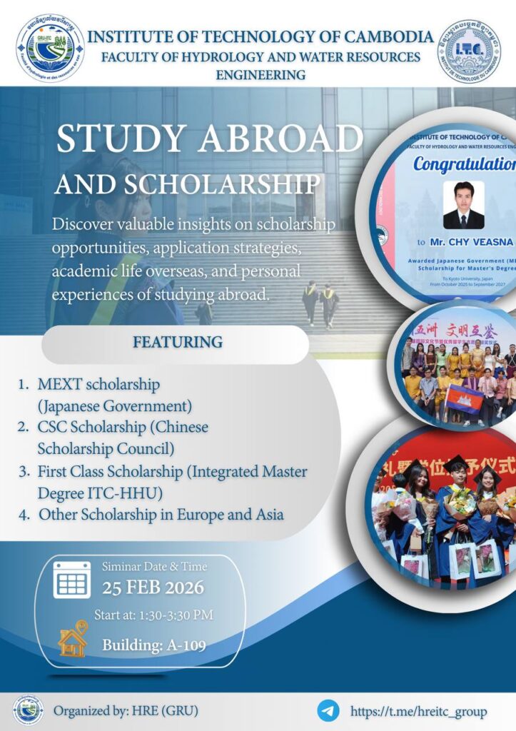 The Faculty of Hydrology & Water Resources Engineering of the Institute of Technology of Cambodia – successfully organized an insightful seminar today, February 25, 2026, dedicated to encourage our students to continue higher degree and apply for the scholarship.